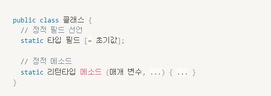 필드와 메소드는 모두 정적(static) 멤버가 될 수 있다. 정적 필드와 정적 메소드로 선언하려면 static 키워드를 사용한다.