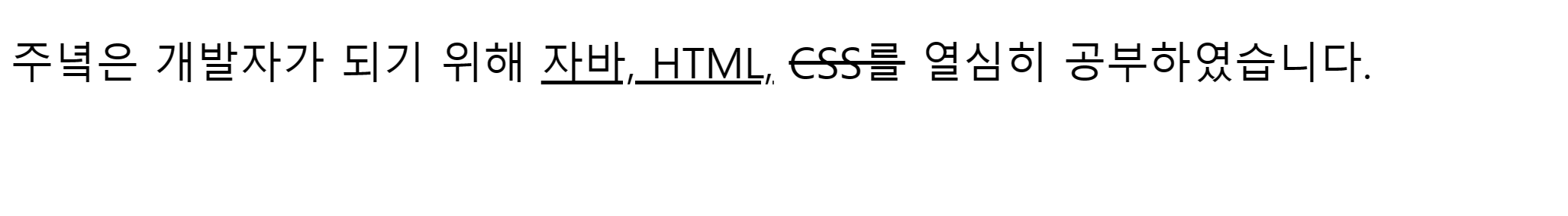 주녘은 개발자가 되기 위해 < ins > 자바, HTML, </ ins > < del > CSS를 </ del > 열심히 공부하였습니다.