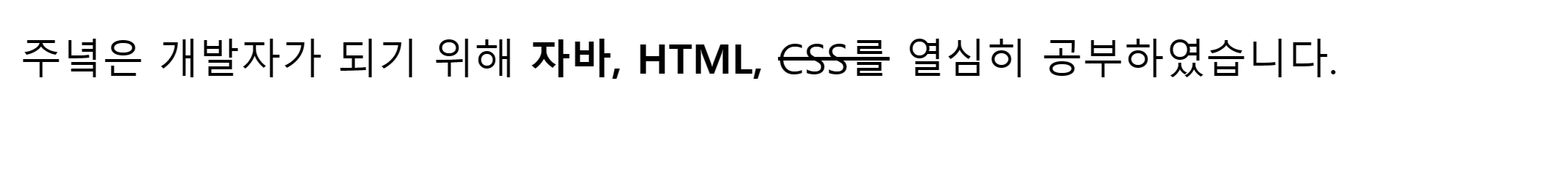 주녘은 개발자가 되기 위해 < strong > 자바, HTML, </ strong > < del > CSS를 </ del > 열심히 공부하였습니다.