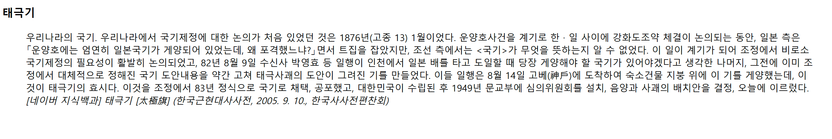 < br >< cite > [네이버 지식백과] 태극기 [太極旗] (한국근현대사사전, 2005. 9. 10., 한국사사전편찬회) </ cite >