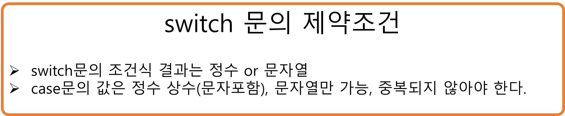 - 단, switch문은 제약조건이 있기 때문에, 경우의 수가 많아도 어쩔 수 없이 if문으로 작성해야하는 경우가 있다.