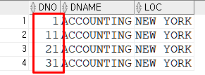 -- 기본키 : DNO(부서번호),(테이블의 데이터 중에서 유일한 값을 가져야 되는것)