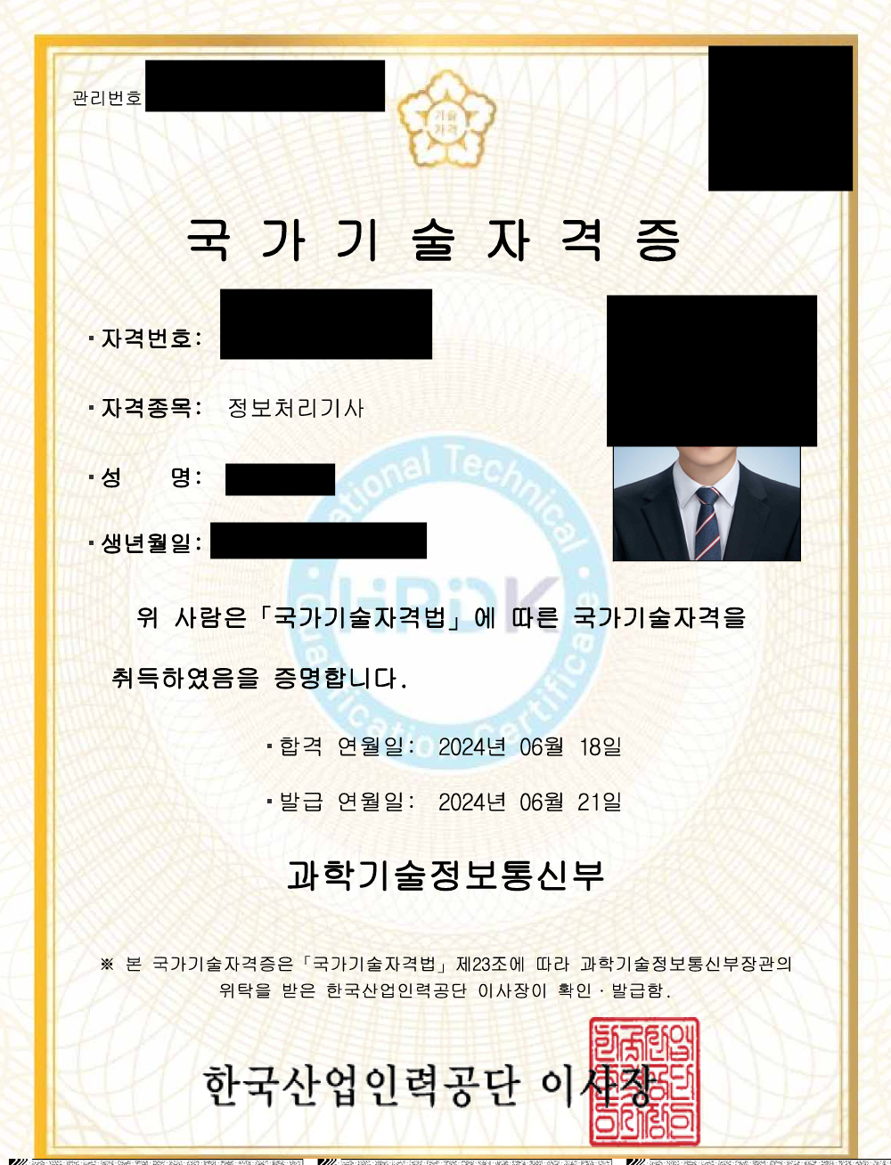 드디어 나도 정처기를 손에 넣었다. 이제 리눅스 마스터랑 SQLD 자격증도 도전 할 예정이다.