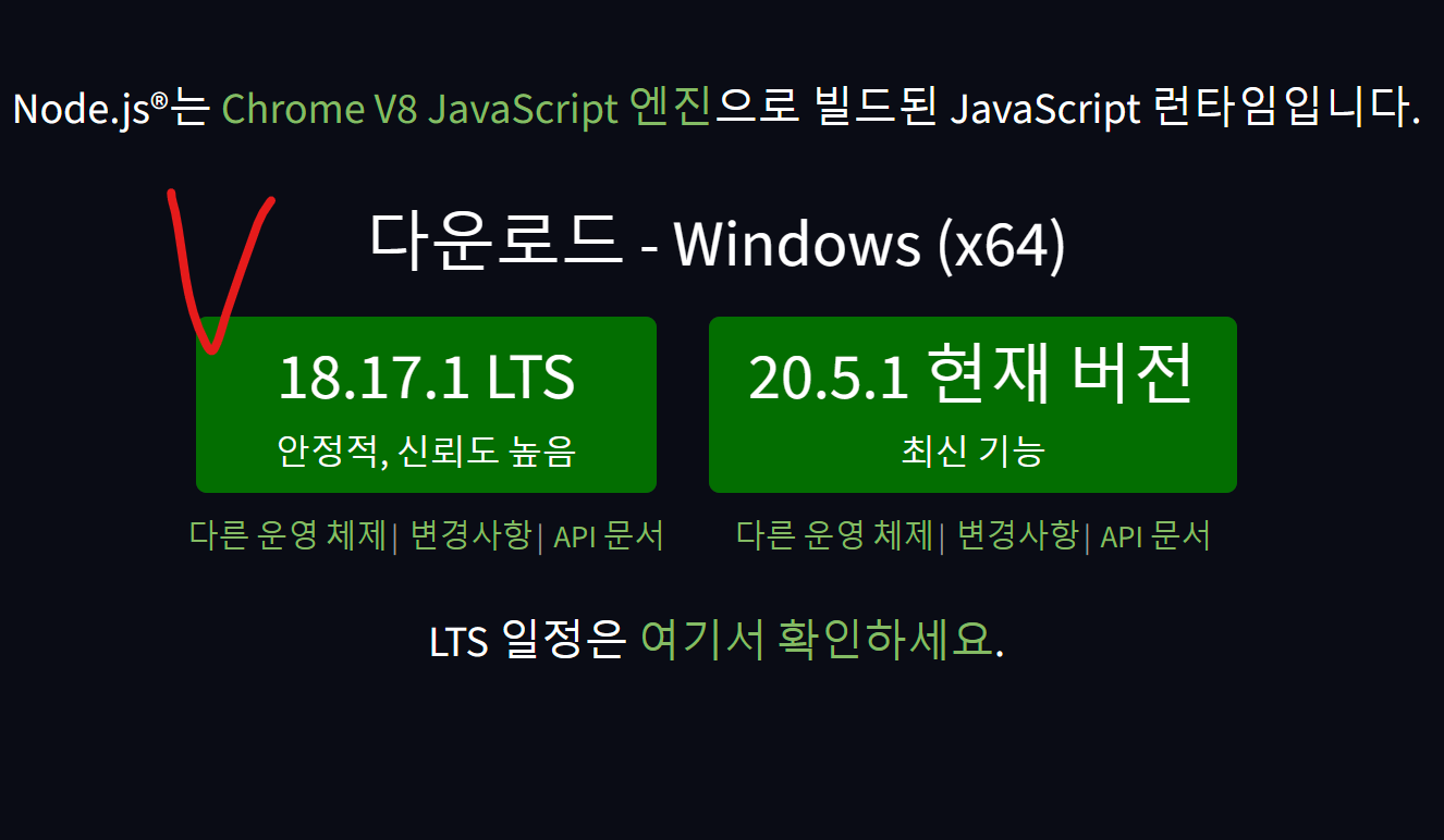 Node.js 홈페이지에서 LTS 버전을 다운받아 설치해주면됩니다.