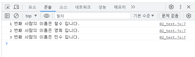 console.log(`${index + 1} 번째 사람의 이름은 ${nameArr[index]} 입니다.`)