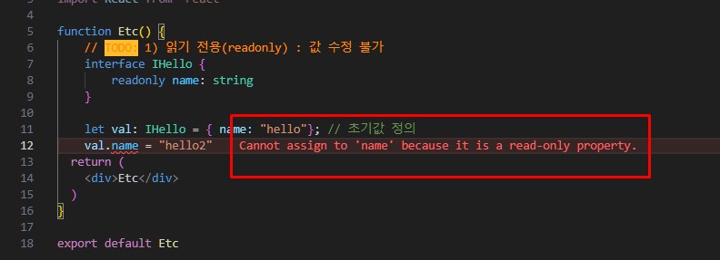 // TODO: 1) 읽기 전용(readonly) : 값 수정 불가