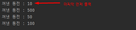 Coin coin = coinStack.pop(); // 마지막 코인 꺼내기
