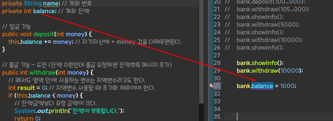 bank 클래스에서 balance라는 변수 앞에 private를 사용하면 maintest 클래스에서 balance의 변수를 사용하지 못한다.